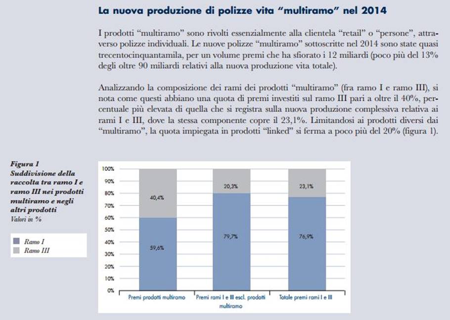 Avendo spuntato la denominazione di polizze vita, le Polizze Multiramo sono vendute come componente aggiuntiva della pensione; sono impignorabili, e quindi, molto amate da chi è soggetto alla legge fallimentare (commercianti ecc.). Caratteristiche: una parte del premio viene investita in una gestione separata; il restante in strumenti Unit Linked. In alcuni casi la compagnia ha la possibilità di decidere quella divisione senza sentire l’”assicurato”, ma solo in funzione delle previsioni di mercato. La suddivisione tra Ramo I e Ramo III è fornita dalla Relazione 2015 dell’Ania. Oltre il 40% dei premi investiti è collocato su prodotti linked.